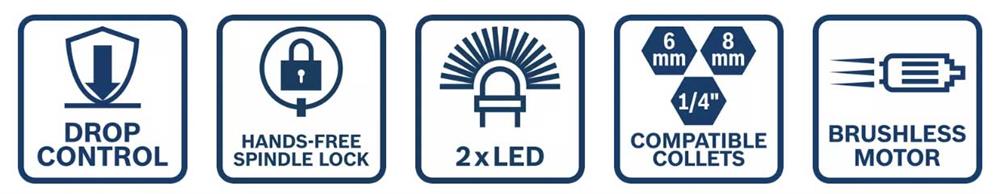 Verktøyet har en lav profil som sikrer bedre balanse, og med håndfri spindellås blir bytting av fresebits både enkelt og effektivt. Fresedybden kan justeres presist, noe som gir nøyaktighet i arbeidet, og de to LED-lampene gir bedre arbeidsforhold. GKF 18V-8 er også verdens første 18-volts håndoverfres med tilpassede støvsugeradaptere for både overflate- og kantfresing. Dette sikrer effektiv støvoppsamling.