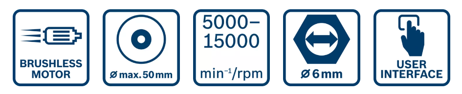 GWG 12V-50 S er allsidig for sliping, avgrading, pussing, rengjøring og klargjøring av overflater pluss fjerning av sveisesømmer og sveisepunkter, særlig på metall. Den kan brukes sammen med ulike 50 mm slipeskiver som er tilgjengelig på markedet og 6 mm og 8 mm flenser. Den har også et innovativt brukergrensesnitt med indikator både for hastighet og batterilading. Den innovative spindellåsen sørger for enkelt tilbehørskift.