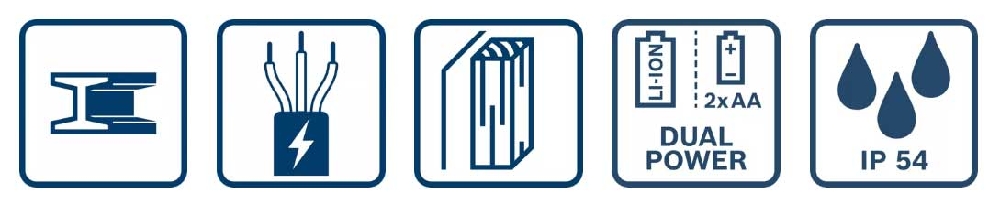- Oppdager metall, strømførende ledninger og lekter i veggen